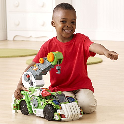 In the world of dinosaurs, size means everything. Jagger the T-Rex by VTech uses problem-solving skills to transform from a super-cool construction crane to a fierce Tyrannosaurus Rex in just a few steps. Choose your driver on the 1.5" LCD screen that promotes visual awareness in vehicle mode, then command Jagger to "Start your engine," to move the earth with a 360-degree rotatable-extending crane, teaching cause and effect relationships. Yell "Fire," to launch the voice-activated drill bit or push the dirt with the mini-transforming bulldozer for more imitative play. Jagger's animated dinosaur eyes will make any other dinosaur flee, as your child commands this beast. "Roar with me," triggers one of 20 voice commands to activate his motorized jaw and elicit his mighty warning cry. Realistic dinosaur sounds and phrases provide auditory stimulation and add to your child's play and when they press the "Talk" button, Jagger teaches pre-historically awesome dinosaur facts that introduce science concepts and keep your child engaged in independent play. He's the biggest and the best...all other dinos bow down before him.Feature