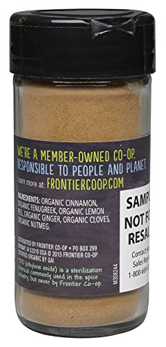 -. Feature : Organic / Kosher / 1.69 Ounce Bottle / An organic, aromatic blend of warm spices for pies, crisps, puddings, cakes and cereals / Certified Organic, Kosher / Non-Irradiated / Frontier is a member owned co-op, responsible to people and planet