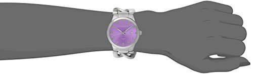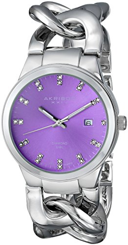 Silver-tone base metal case with a base metal twist bracelet. Fixed silver-tone bezel. Purple sunray dial with luminous silver-tone hands and diamond hour markers. Minute markers around the outer rim. Dial Type: Analog. Luminescent hands. Date display at the 3 o'clock position. Quartz movement. Scratch resistant mineral crystal. Pull / push crown. Snap down case back. Case diameter: 38 mm. Case thickness: 12 mm. Round case shape. Band width: 24 mm. Band length: 7.5 inches. Jewelry clasp. Water resistant at 10 meters / 33 feet. Functions: date, hour, minute, second. Dress watch style. Watch label: Hong Kong. Akribos XXIV Purple Dial Silver-tone Base Metal Ladies Watch AK759SSPU.Feature