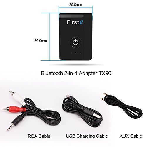 WHAT YOU GET: FirstE 45-day money back guarantee & 18-month warranty with professional customer service,1 x FirstE tx90 Bluetooth 4.1 Receiver and Transmitter,1 x Micro USB Charging Cable,1 x 3.5mm Audio Cable, 1 x RCA Cable,1 x User Manual.