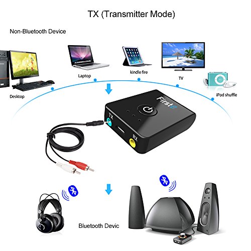 WIRELESS & SMART LIFE: When you watching TV and want to enjoy the wonderful plot quietly or do not to bother your families, just connect the FirstE tx90 to your TV with 3.5mm audio cable /RCA cables, and paired with your Bluetooth headsets.