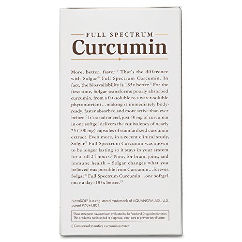 More, better, faster. That’s the difference with Solgar Full Spectrum Curcumin. In fact, the bioavailability is 185x better. For the first time, Solgar transforms poorly absorbed curcumin, from a fat-soluble to a water-soluble phytonutrient. making it immediately body-ready, faster absorbed and more active than ever before. It’s so advanced, just 40 mg of curcumin in one softgel delivers the equivalency of nearly 75 (100 mg) capsules of standardized curcumin extract. Even more, in a recent clinical study, Solgar Full Spectrum Curcumin was shown to be longer lasting so it stays in your system for a full 24 hours. Now, for brain, joint, and immune health ? Solgar changes what you believed was possible from Curcumin…forever. Solgar Full Spectrum Curcumin. one softgel, once a day?185x better.