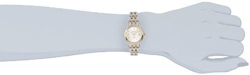 [Description] Round 25mm case finished in polished silver-tone with gold-tone bezel Silver-tone sunray outer dial with matte white center Gold-tone gilt applied roman xii_ vi_ ix with stick markers at other hours Gold-tone framed date function window at 3 o``clock_ two-tone bracelet with jewelry clasp closure Water resistant to 99 feet (30 M): withstands rain and splashes of water_ but not showering or submersion