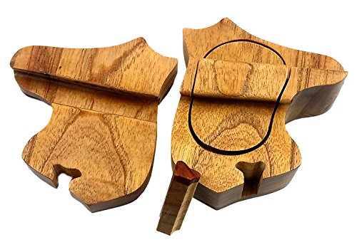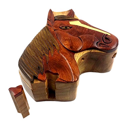 "Mane Stay" Horse Head All Natural Exotic Woods Puzzle Box, 4.75 X 4.5 X 2" with Sliding Wooden Key Lock, Sliding Cover and Inner Lid to Hidden Compartment. Hand-made Wood Onlay Design on Lid.