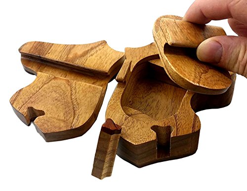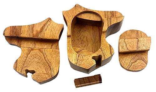 Beautifully hand-crafted puzzle box with carved and inlaid woods applique decor on lid. Remove wooden slider key, slide off cover then remove inner lid to reveal hidden compartment.