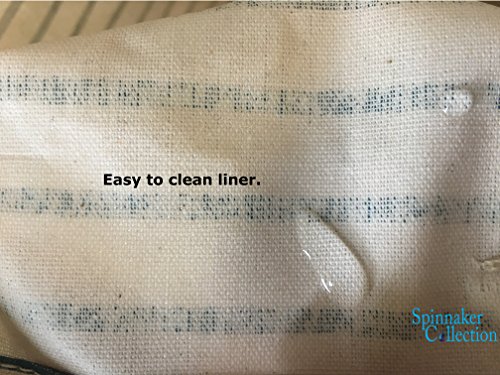- LINED CANVAS FABRIC Cloth - Pack laundry and clothes in bulk - 18 inches deep - wipe clean lined fabric. Popup with an easy shake. Water beads on the interior liner, quick drying. Dark blue stripes (almost looks black if viewed in the shade) Not only does the lining keep moisture in, it also keeps it out. (top closure fabric is not waterproof)
