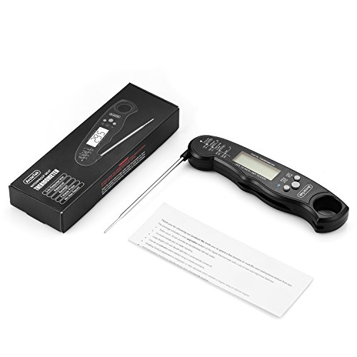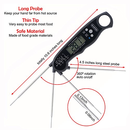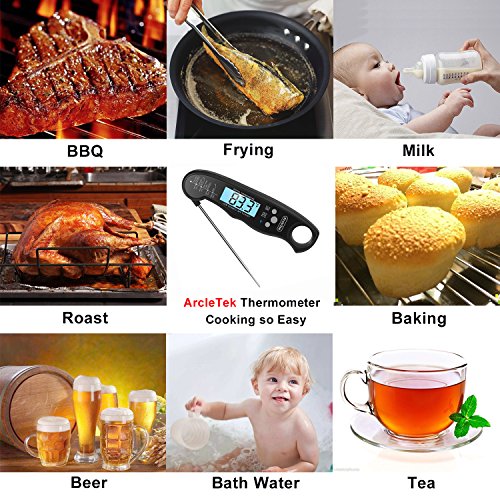 The ArcleTek new generation meat thermometer is designed to optimized solution for cooking, BBQ, and grill outside or inside kitchen. It will bring you to enjoy simple and perfect cooking as its great progress in operation, performance and function. Easy Operation ? Only 2.4 oz and with a well-designed hand grip, comfortable to use and easy to carry ? Large LCD readout ? Bright backlight, convenient for darkness environment ? Hold function to record data ? 5 inches long probe thermometer, keep your hand away from hot source, fit for cooking, BBQ, grill ? ℃/℉ switch button ? Auto On/Off when probe unfolded/folded, auto shut off after 10 minutes if no operation ? Large hanging hole ? Strong magnet to attach High performance ? 3 seconds instant thermometer with high sensitive and precise sensor ? Accurate to ±1℃ in typical cooking temperature ? Can be calibrated with mixture of ice and water Safety ? The ArcleTek cooking thermometer is made of food grade materials Waterproof ? The thermometer is based on IP67 waterproof standard design. It can be washed with water and survive accident falling into water Specification ? Range: -58℉~572℉ (-50℃~300℃) ? Accuracy: ±1℃(±2℉) at -20℃~150℃(-4℉~150℉) and ±2℃(±4℉) at 150℃~200℃(302℉~392℉), over 2℃(4℉) at the other ranges ? Battery: CR2032 button cell ? Probe length: 5 inch ? LCD display size: 1.65 L x 0.59 W inches ? Product weight: 68g ? Product dimensions: 6.1 L x 1.5 W x 0.7H inches Noted Do not leave the meat thermometer in the oven while cooking. Do not touch hot probe with bare hands. Wash the metal probe of the therometer in soapy water. The thermometer can survive accidental falling into water, but don't completely immerse it for more than 5 minutes. Clean the thermometer by hand or using water.