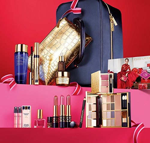 Deluxe Eye and Cheek Palette with 12 Best-Selling Pure Color EyeShadow shades: Sugar Cube, Sugar Biscuit, Riviera Rose, Ivory Slipper, Tempting Mocha, Lilac Whimsy, Hot Cinnamon, Nude Fresco, Wild Truffle, Amethyst Spark, Lavish Mink and Chocolate Bliss; plus 2 Best-Selling Pure Color Blush shades: Alluring Rose and Sensuous Rose • 3 Pure Color Long Lasting Lipsticks (full-size), in Sugar Honey, Candy and Bois de Rose • Lip Gloss Compact with Pink Innocence, Magnificent Mauve and Orchid Passion • Pure Color Intense Kajal Eyeliner in Blackened Black (great for smoky eyes) • Pure Color Nail Lacquer in Fallen Angel • Sumptuous Extreme Lash Multiplying Volume Mascara (full-size) in Extreme Black • Gentle Eye Makeup Remover (full-size, 3.4 oz.) • Advanced Night Repair Synchronized Recovery Complex II (deluxe travel size) • Revitalizing Supreme Global Anti-Aging Creme (deluxe travel size) • 2 Modern Muse Eau de Parfum Travel Sprays • Look Card - to get started on your Holiday Look now. • Gold Crocodile-embossed Cosmetic Case • Navy Satin Train Case