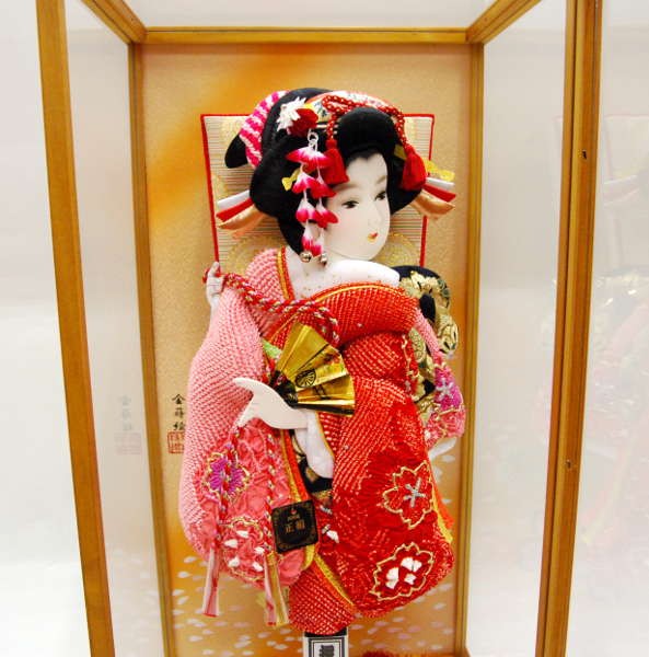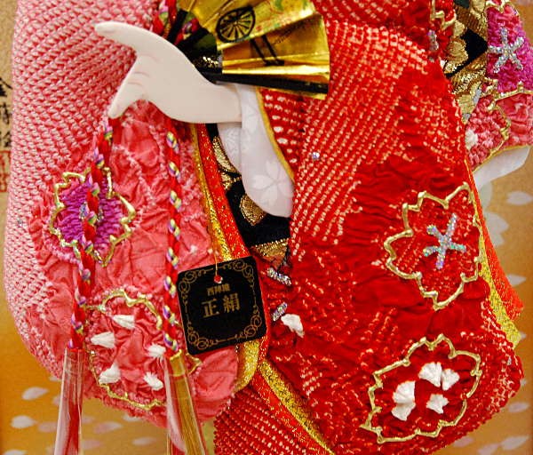 ピンク色絞りの正絹(シルクの)の衣装を着た 人気の羽子板飾りです