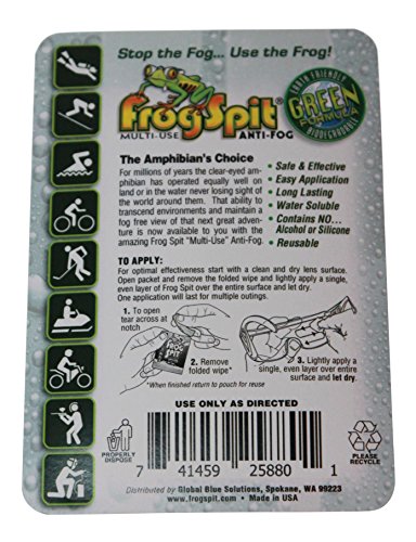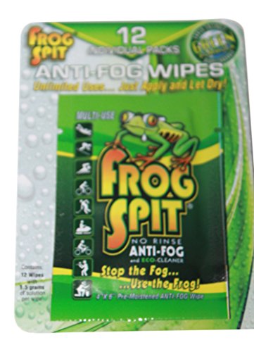 Frog Spit anti- fog wipes are ideal for anyone looking for an easy, effective, and convenient solution to fogging. Just remove the pre moistened wipe from the pouch and lightly apply a thin layer solution which will dry clear in just seconds. Each wipe contains enough Frog Spit solution for multiple applications.