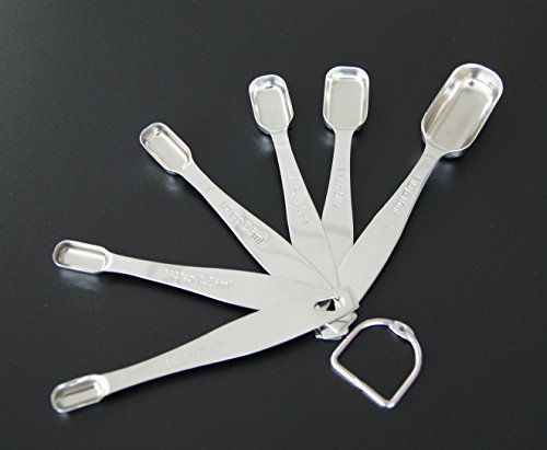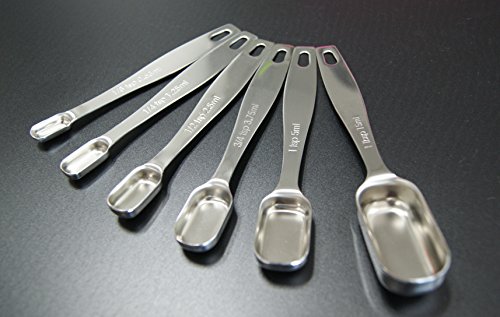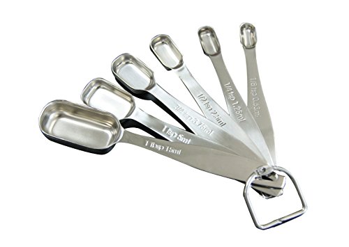 - DESIGNED FOR CONVENIENCE - 6 measuring spoons (1/8, 1/4, 1/2, 3/4, 1 tsp, 1 TBSP) are engineered for accuracy and convenience, and they even show the Metric equivalent measurements, so you'll never have to use a conversion chart again.