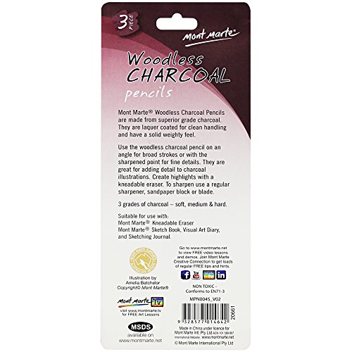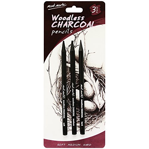 Mont Marte Woodless Charcoal Pencils, 3 Piece. Features 3 Grades Of Charcoal Including Soft, Medium and Hard.