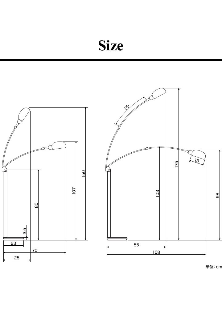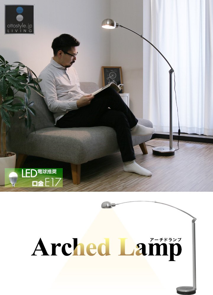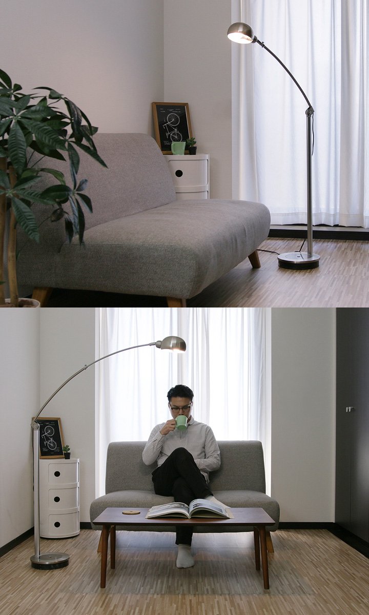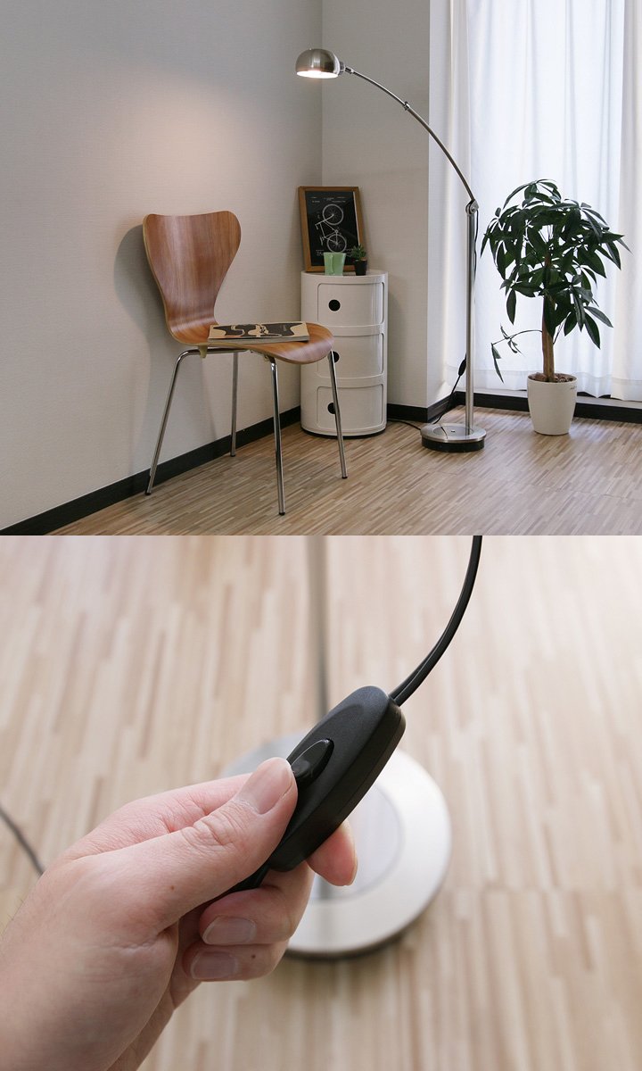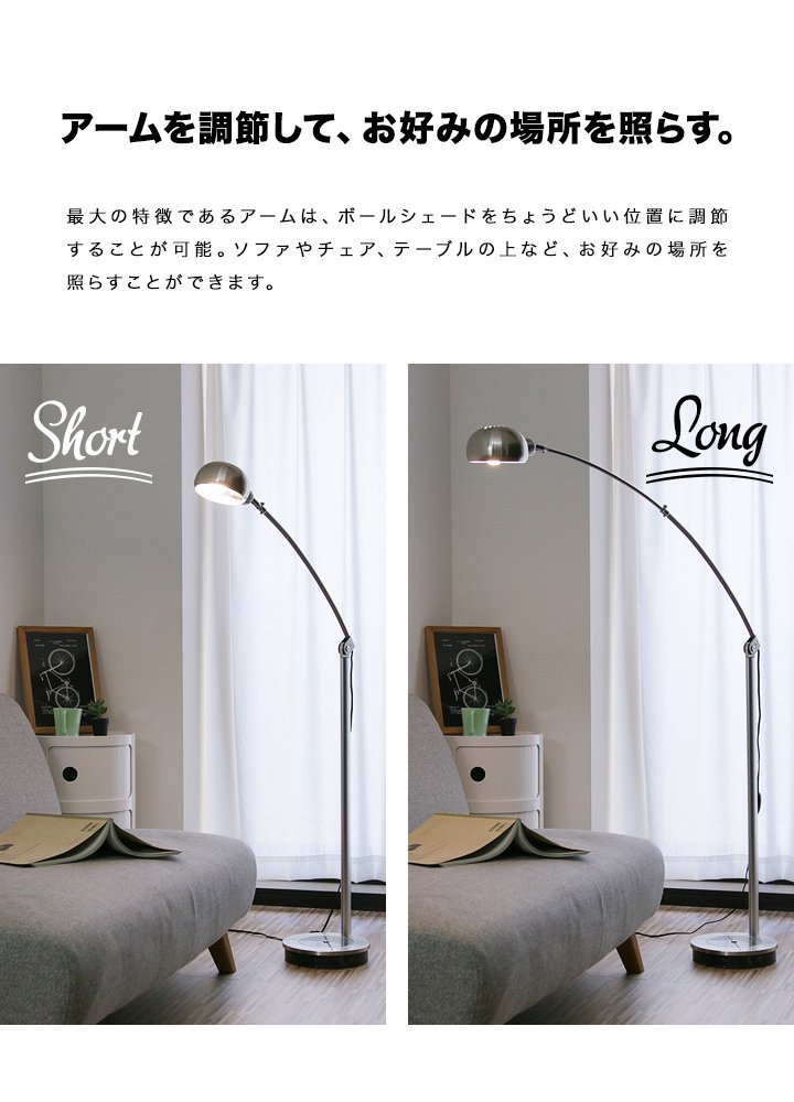 It is a floor light that draws a beautiful arch from a heavy base to a ball sade in a position just stretching from the side and a slender pole.