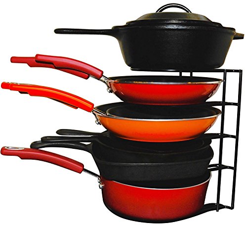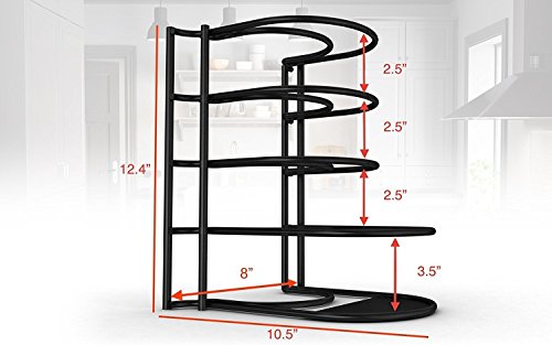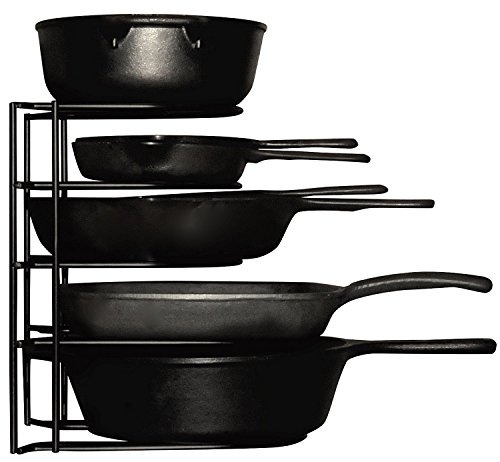 - 5 TIER PAN RACK with Bottom Tier 1 INCH TALLER for Larger Pans. This HEAVY DUTY organizer also holds CAST IRON. This Pot and Pan Rack is made of PREMIUM, DURABLE, STURDY Metal that is EASY to Clean and PROTECTS your pans from scratching each other.