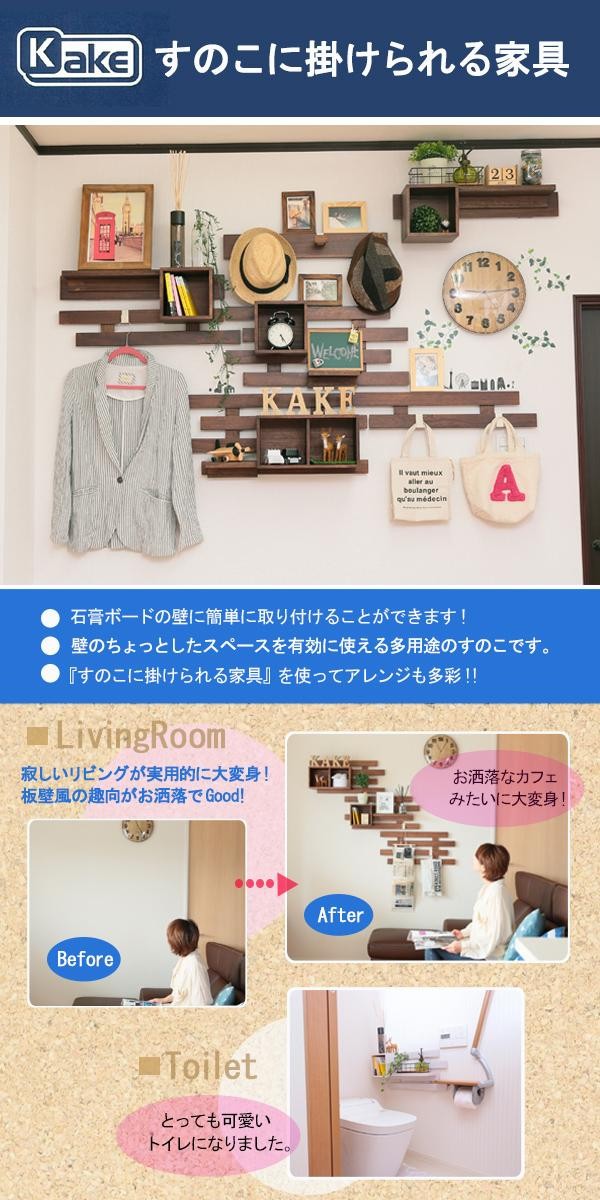 『壁に付けられるすのこ』に掛けられる家具シリーズ。 製造国:中国 素材・材質:天然木、桐材(ラッカー塗装) 商品サイズ:約W18×D13.5×H6cm(フック部含む) 重量:約0.2kg 仕様:耐荷重:2kg完成品 付属品:取扱説明書 ※サプライヤー直送品 ご注文後3~4営業日後の出荷となります【商品名】Kake すのこに掛けられる家具 棚18cm ダークブラウン・KT-1(DB)