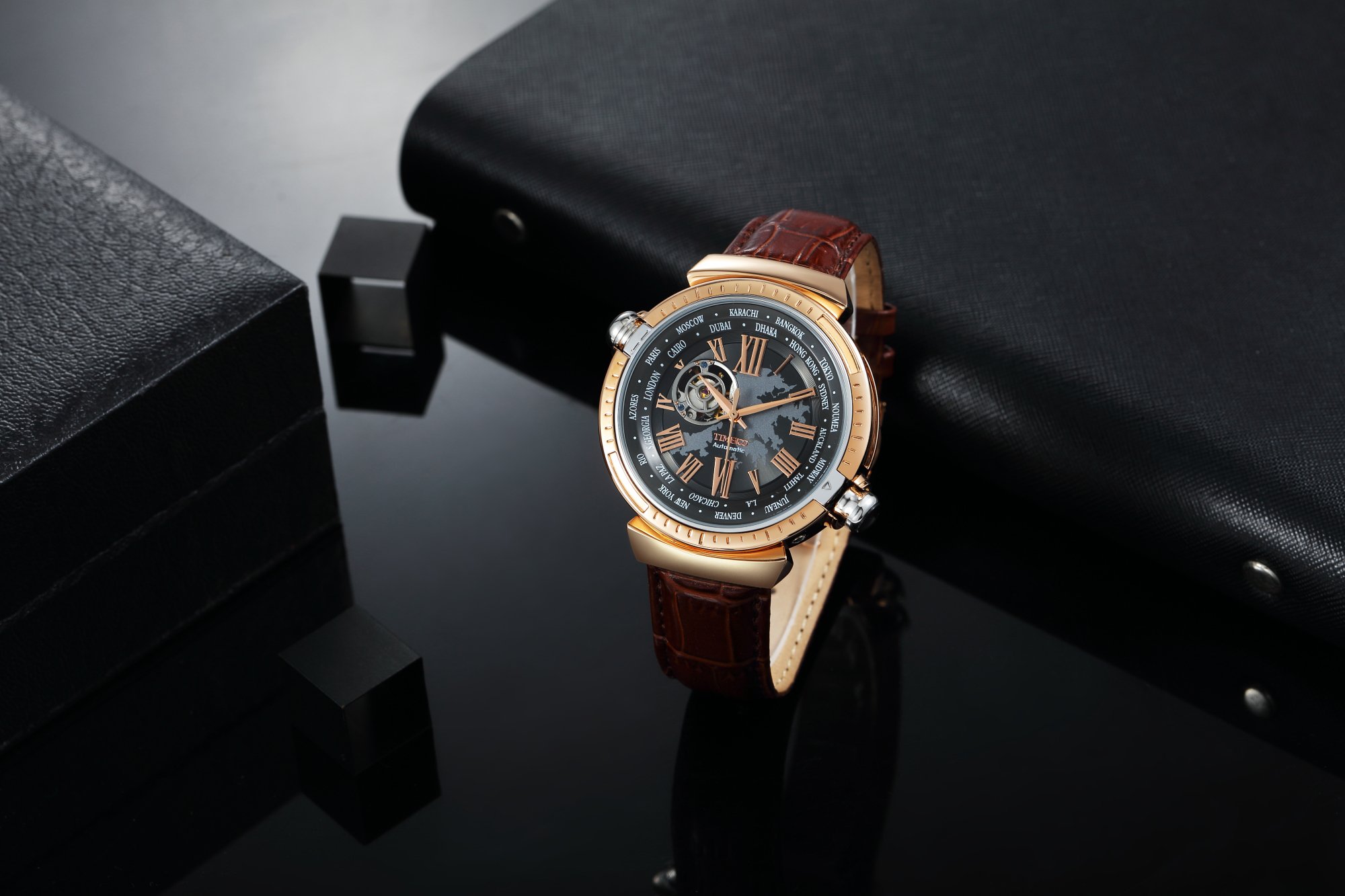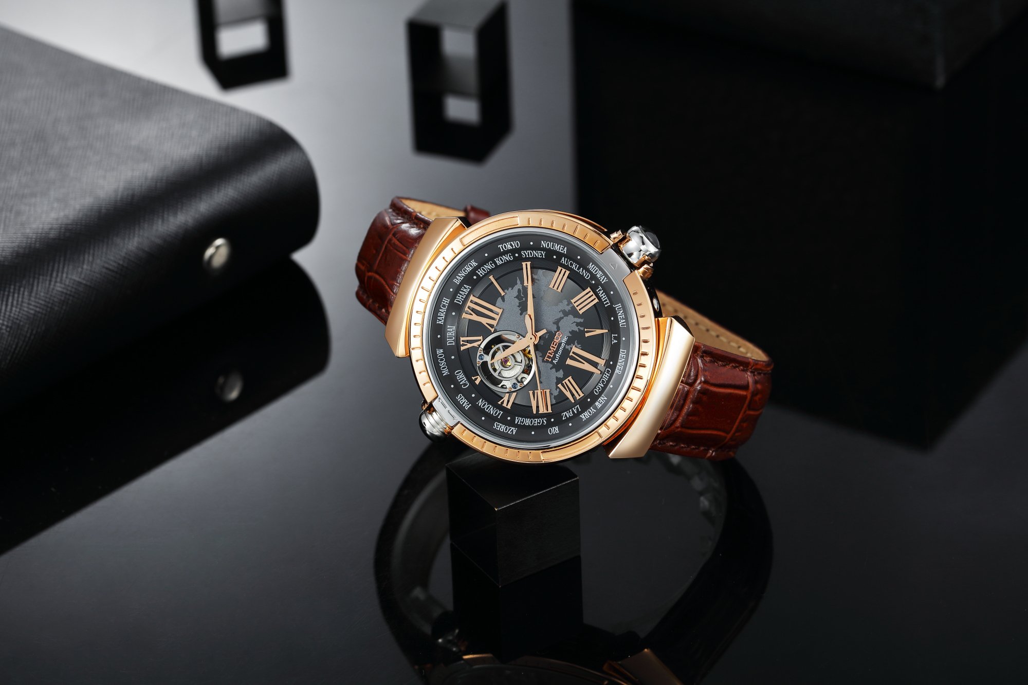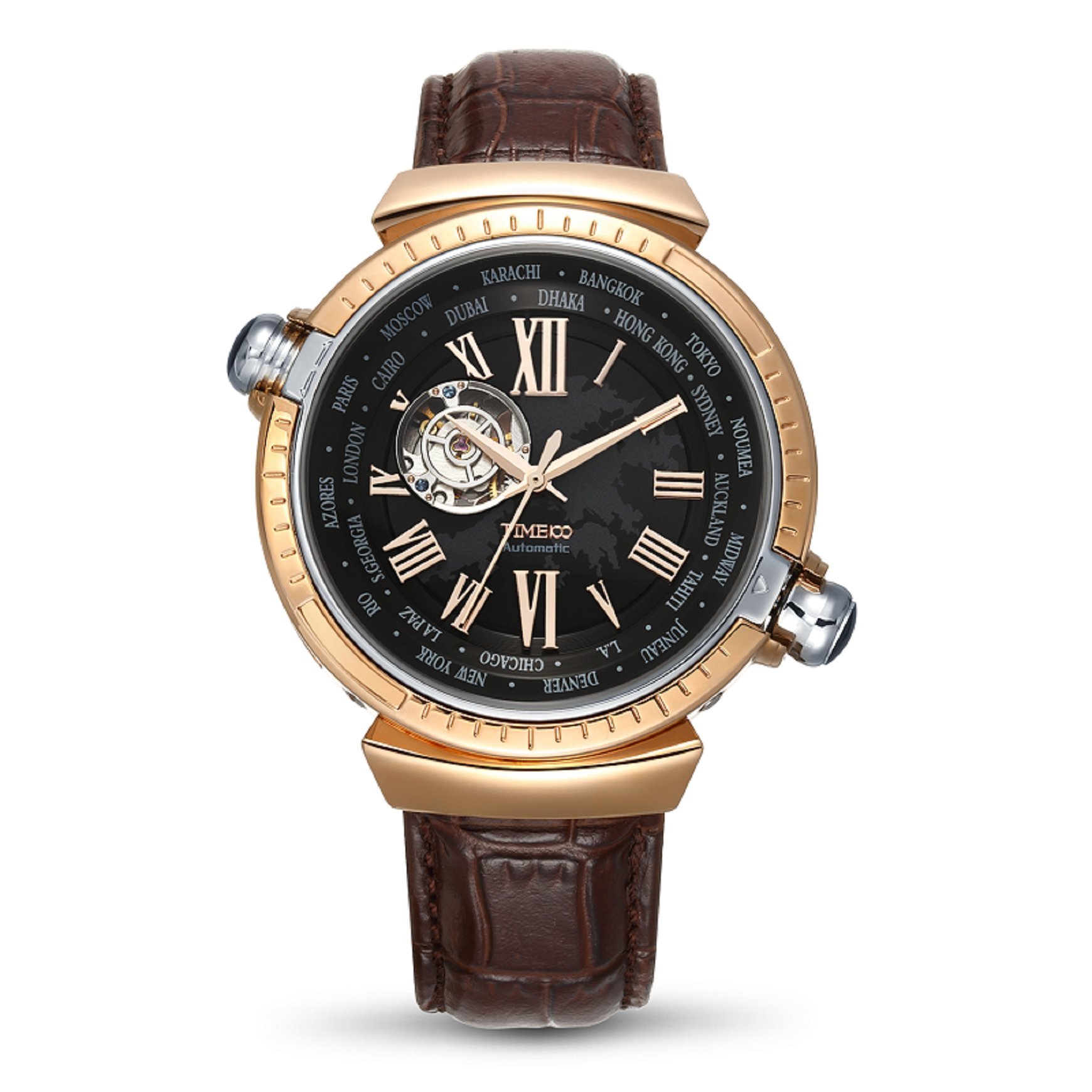 Automatic winding mechanical type men's wristwatch with world time function.