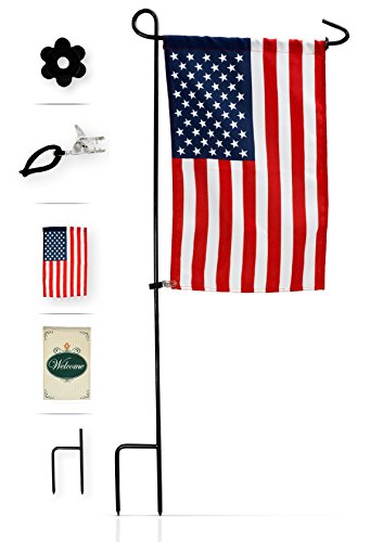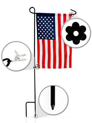 - COMPLETE PATRIOTIC GARDEN FLAG STAND SET: With GreenWeR AMERICAN FLAG YARD STAND SET you get a double sided American flag, almost three foot tall, wrought iron garden flag stand, rubber stopper and anti-wind clip to show your patriotism; the flag measures twelve by eighteen inches