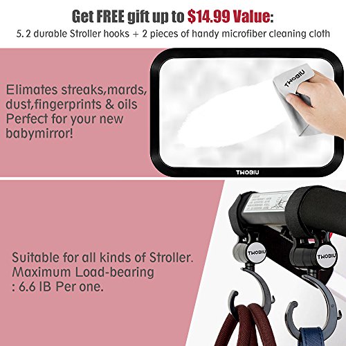 Free Gifts & Warranty: 2 high-quality hooks and 2 mirror cleaning clothes are FREE bonus. Hooks are convenient for strollers to hang baby essentials, cleaning clothes could remove dust, dirt and fingerprints on your back seat baby mirror. LIFETIME warranty!