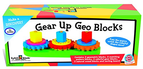 Your child gets gears, shapes, colors and fun galore with the Gear Up Geo Blocks from the Small World Toys Ryan's Room collection. This 12-piece sorting board introduces shapes and colors. When the blocks are stacked and the gears mesh, they really turn. Mix and match the different blocks and learn the names of shapes and colors. Helps children practice hand-eye coordination, concentration, and expand their vocabulary. Bright colors and patterns make this unusual sorting board a hit with children 12 months and over. Measures 11''W x 4.25''D x 3.5''H. The Small World Ryan's Room collection inspires discovery and imagination, fostering valuable developmental skills kids will use for a lifetime. We call it play with a purpose - kids just call it fun. Small World Toys has been a leading toy manufacturer for 50 years. We believe that play is an integral and necessary part of a child's development and education. At Small World Toys, we are committed to developing fun, innovative, high quality products for children of all ages.Feature
