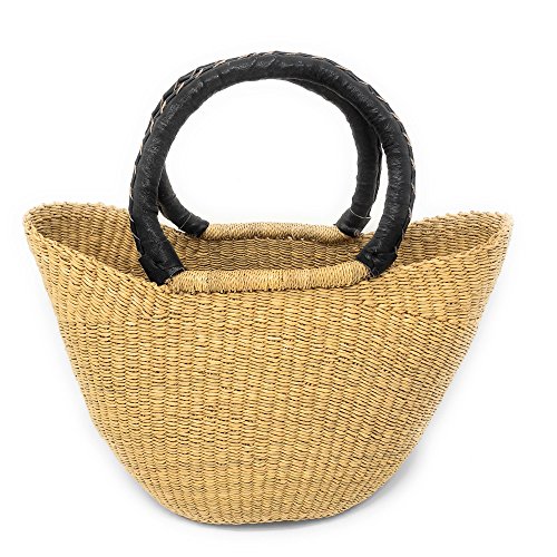 - Made of thick and durable elephant grass with black leather-wrapped handles