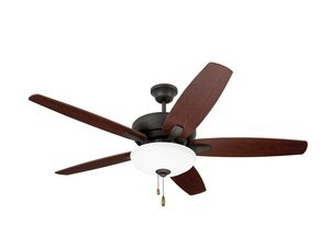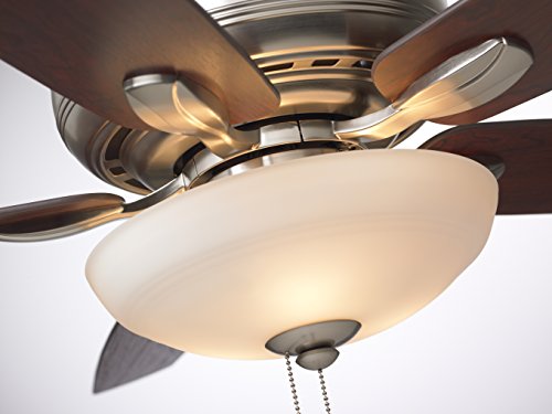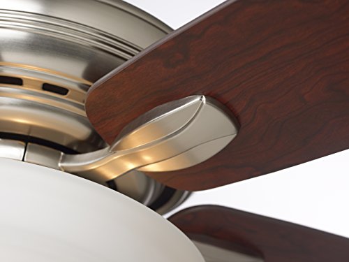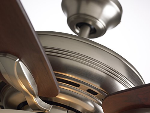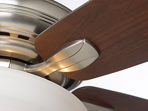 The Ashland's 52-inch Brushed Steel housing, Dark Cherry/Walnut dual finish blades and removable light fixture with Opal Matte glass make this ceiling fan an elegant addition to any home décor. As the most versatile offering in our collection of Pro Series ceiling fans, Ashland transitional ceiling fans include a 4-1/2-inch downrod for standard installation or can be mounted on lower ceilings using the close-to-the-ceiling method. Ashland transitional ceiling fans are an easy 'all in the box' solution for today's design and money-savvy consumer and come equipped with 5 reversible blades and 3, 60-watt candelabra base bulbs for the removable light fixture. Pro Series ceiling fans are backed by Emerson's Limited Lifetime Motor Warranty.Feature
