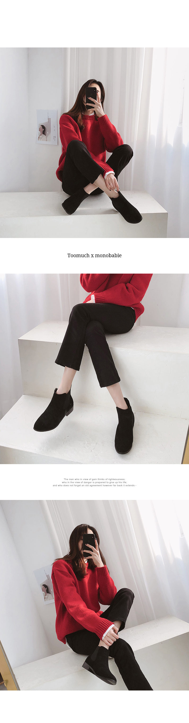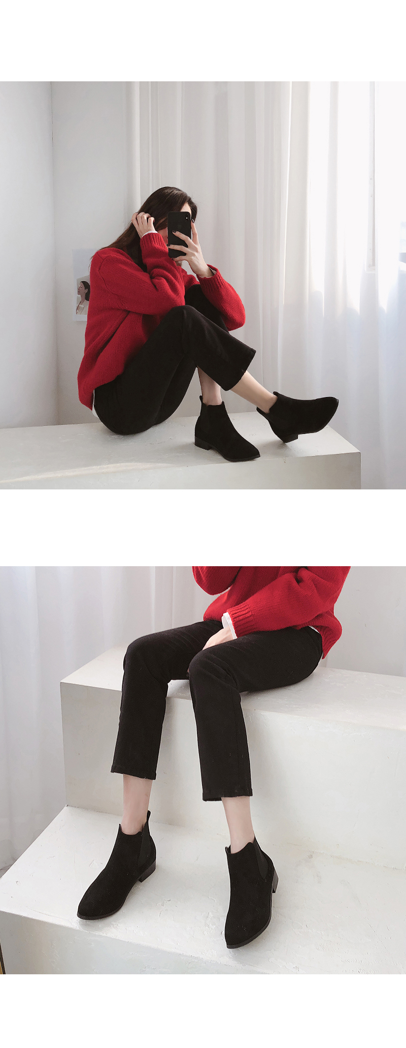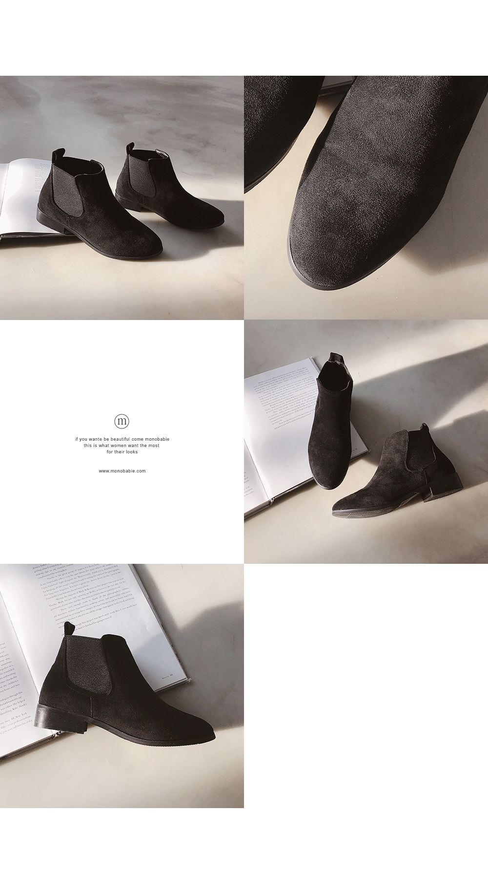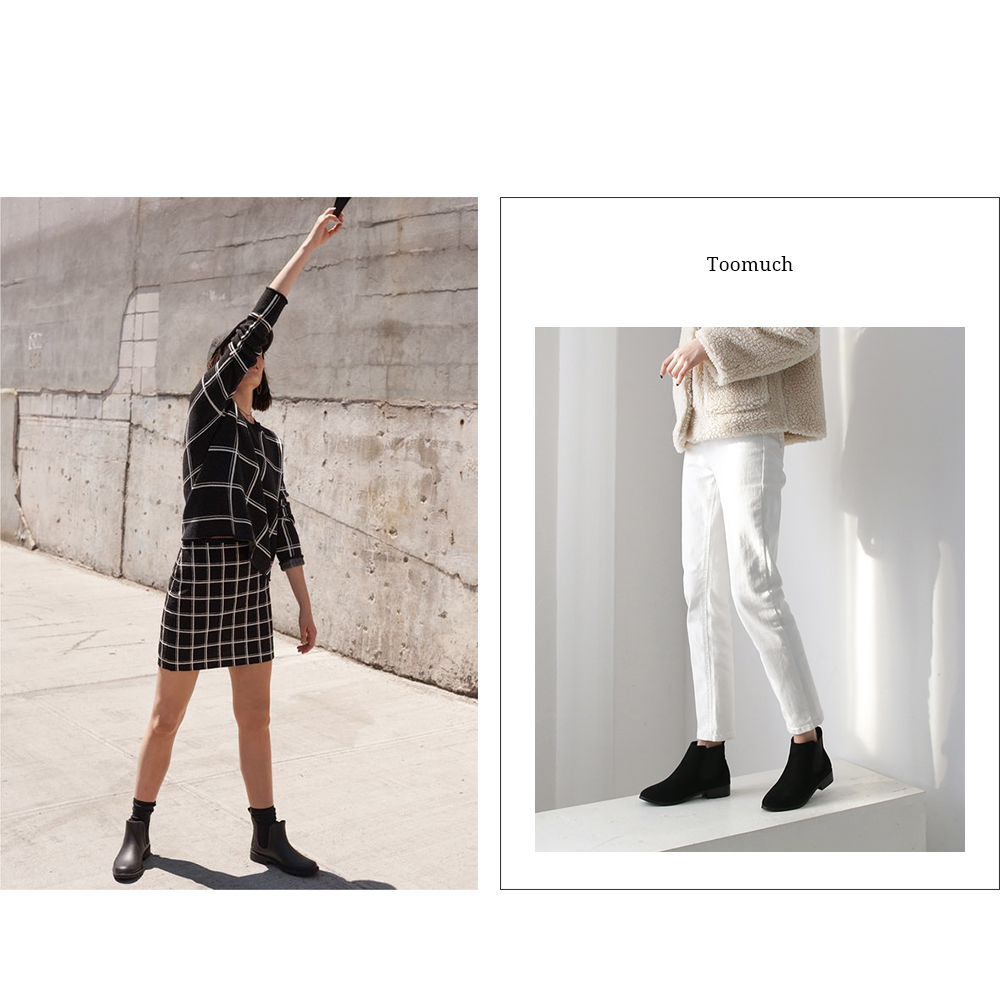라운드진 쉐입이 큐트하게 착화되는 로우굽의 앵클부츠입니다.
