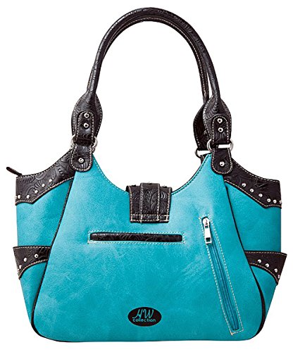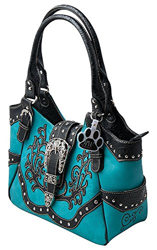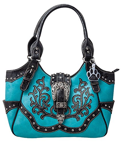 Western handbag is made from high quality premium faux/imitation PU turquoise leather decorated with black trim and scroll designs, rhinestones, silvertone hardware, western floral buckle that snaps closed, and detachable HW Collection key ring/purse charm on the front