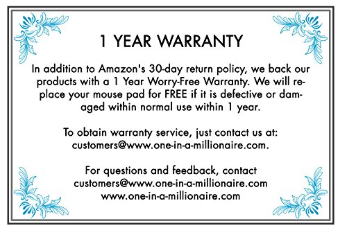 1 YEAR WARRANTY: In addition to Amazon's 30-day return policy, we back our products with a 1 Year Worry-Free Warranty. We will replace your mouse pad for FREE if it is defective or damaged within 1 year of normal use.