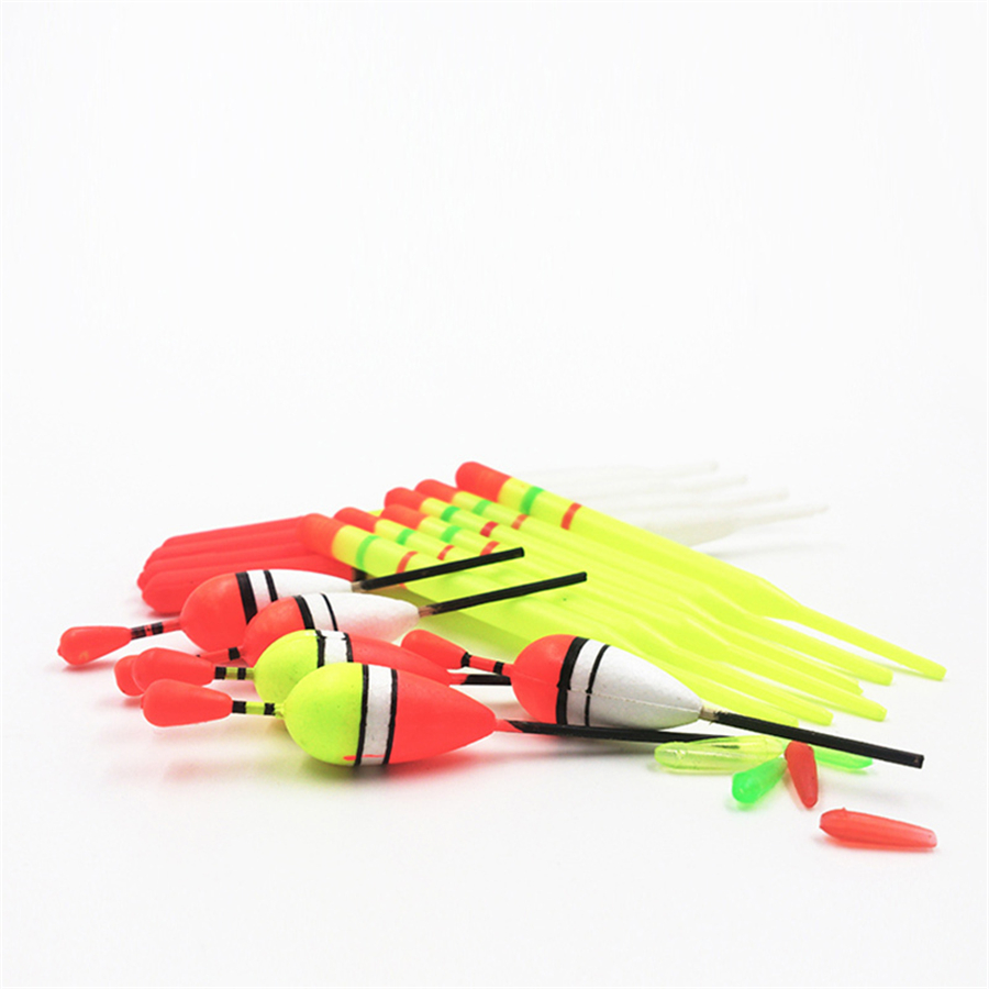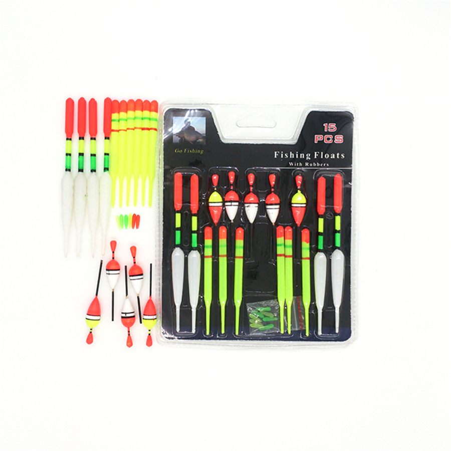 15pcs including : 5pcs bobbers rod(8cm) ,6pcs yellow floats tube(9.5cm) and 4pcs long float slips (15cm)