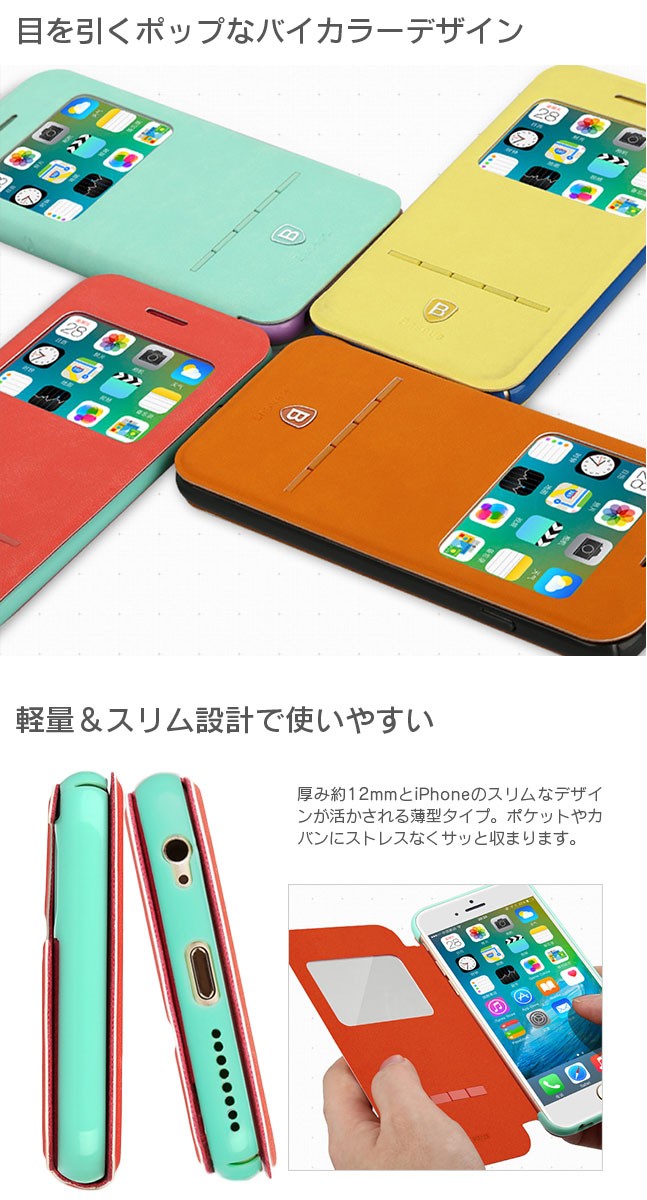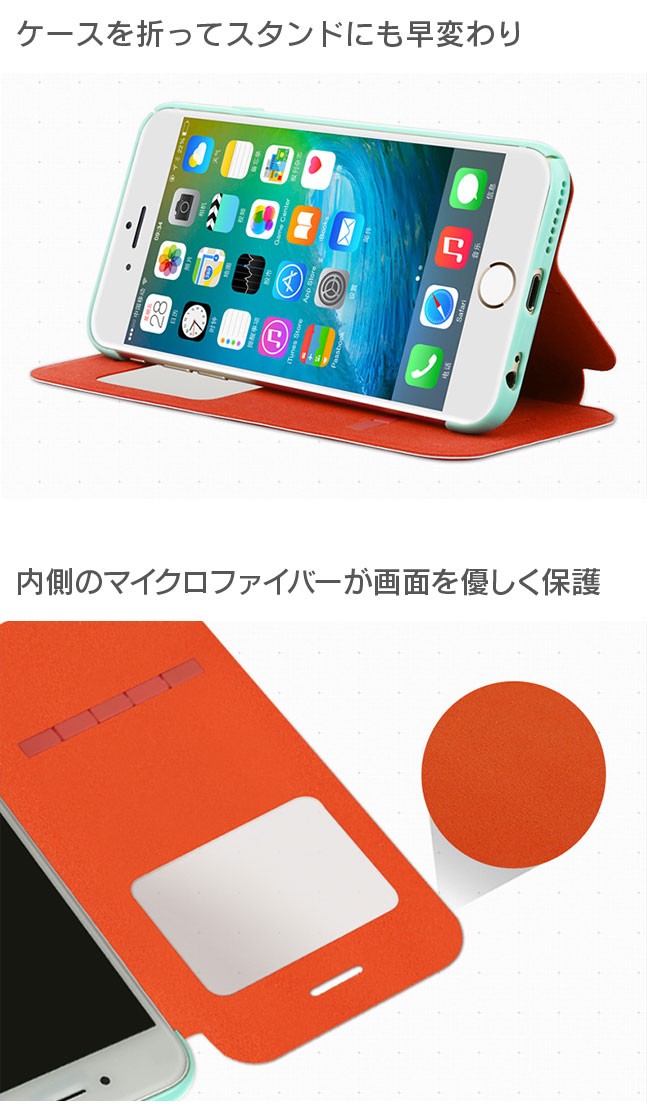 [商品名]小窓付き手帳型 ケース[素材]PU,PC[対応機種]iPhone6シリーズ[厚み]約12mm[備考]※画面にフィルムが貼られている場合、マグネットやスライドバーの反応が鈍くなる場合がございます。※製造時期によってデザインや仕様に若干の変更がある場合がございます。※ご利用のモニターによって、実物と異なる色に表示される場合がございます。予めご了承下さい。