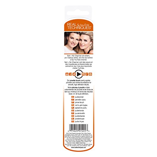 -. Binding : Health and Beauty -. Brand : Real Techniques -. Color : multi/none -. Department : Female -. EAN : 0885781251946 -. Feature : Hand cut hair design allows for even and streak free application of makeup / Synthetic taklon bristles are non-porous and do not trap or absorb product, bacteria and dead skin cells / Bristles are less prone to breakage or damage as well as keep clean and maintain / Uniquely shaped and color coded aluminum ferrule / Online video tutorials at http://www.youtube.com/user/realtechniques -. IsAdultProduct : 0 -. IsAutographed : 0 -. IsMemorabilia : 0 -. Label : Paris Presents Incorporated -. Manufacturer : Paris Presents Incorporated -. Model : PP1401 -. MPN : PP1401 -. NumberOfItems : 1 -. PackageQuantity : 1 -. PartNumber : PP1401 -. ProductGroup : Beauty -. ProductTypeName : BEAUTY -. PublicationDate : 2011-12-05 -. Publisher : Paris Presents Incorporated -. Studio : Paris Presents Incorporated -. Title : real Techniques Powder Brush -. UPC : 709102213300