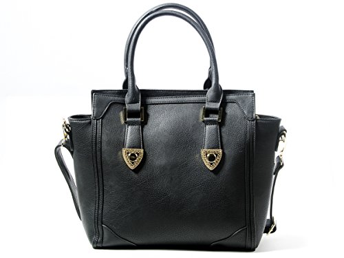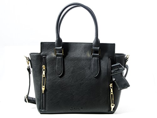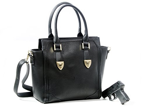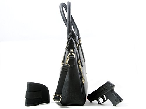 -. Feature : Faux leather purse of contemporary design with gold toned hardware, a very classy looking purse. / Large 9 x 10" gun pocket with velcro holster that attaches in any position you want on either side of the pocket, good for left or right draw. / One large interior pocket with two open pockets on the front wall, two zipper pockets on the back wall that has an open pocket between them. / Measures 12 x 12, x 3-1/2 with a detachable, adjustable, crossbody strap and two 7" drop rolled leather handles. / Hard to find left or right draw concealed carry handgun purse that will fit larger size guns.