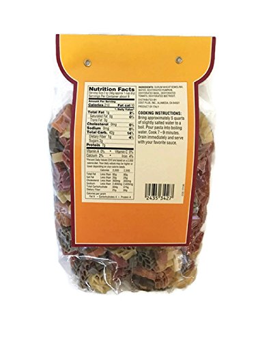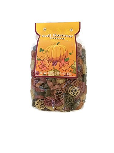 Leaves, pumpkin pasta pasta include 3 different colors.serving size per bag is about 9, 210 calories per serving, cooks in 7-10 minutes