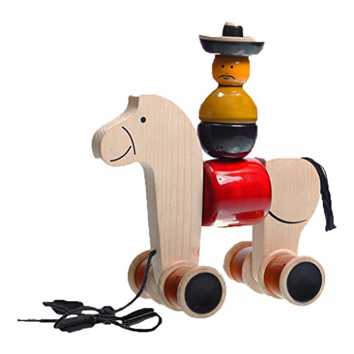 Watch the horse and rider bounce along as they are pulled. The rider is also a simple stacker. The stacker encourages hand eye coordination and fine motor development and the brightly colored pieces are large enough for little hands. Size: 175mm high x 90mm wide x 195mm long Age: 18 months + Care: Clean with a damp cloth