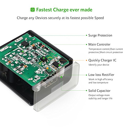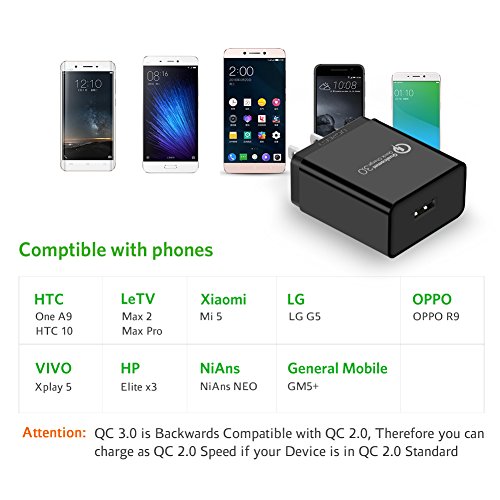 INTELLIGENT TECHNOLOGY: Supports 3.6V-6.5V/2A, 6.5V-9V/2A, 9V-12/1.5A output, worldwide 110 - 240V AC input. Built-in double chips with quick charge identification and power controlling, intelligently controls charging rate and matches a proper rate for smartphones or tablets, keep the battery durable all the time. Compatible with all versions of Qualcomm Quick Charge Technology (1.0, 2.0 and 3.0) and USB-C devices. Standard charge for Apple iPhone and iPad.
