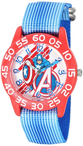 -. Binding : Watch -. Brand : Marvel -. Color : Blue -. Department : boys -. EAN : 0843231098015 -. Feature : Meets or exceeds all US Government requirements and regulations for Kid's watches / 1 year limited manufacturer's warranty / Analog-quartz Movement / Case Diameter: 32mm / Water Resistant To 30m (100ft): In General, Withstands Splashes or Brief Immersion In Water, but not Suitable for Swimming or Bathing -. Label : Marvel-Roll Up -. Manufacturer : Marvel-Roll Up -. Model : W003223 -. MPN : W003223 -. PackageQuantity : 1 -. PartNumber : W003223 -. ProductGroup : Watch -. ProductTypeName : WATCH -. Publisher : Marvel-Roll Up -. Studio : Marvel-Roll Up -. Title : Marvel Boy's 'Captain America' Quartz Plastic and Nylon Watch, Color:Blue (Model: W003223) -. UPC : 843231098015