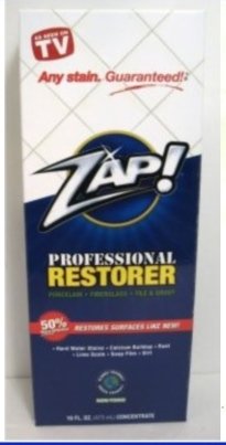 -. Feature : Includes two 10 fl. oz. bottles (concentrate) / Your surfaces will look like new with Zap! Professional Restorer / As Seen on TV / Removes rust and dissolves hard water stains / This cleaner is safe for use on glass, tile, porcelain, grout, fiberglass and real metals
