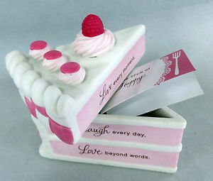 - This cute ceramic slice of cake says 'Live Every Moment, Laugh Every Day, Love Beyond Words'.