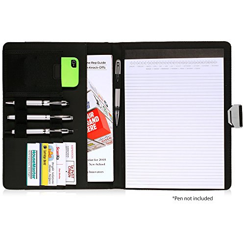 BAGS FOR LESSTM With a stylish cover design and buckle, these portfolios are ideal. These portfolios feature a front cover pocket, hook closure, inside phone pocket, 7 elastic loops for your pens or USB drives (pens or USB not included), 4 card pockets, and a 20 ruled page notepad.