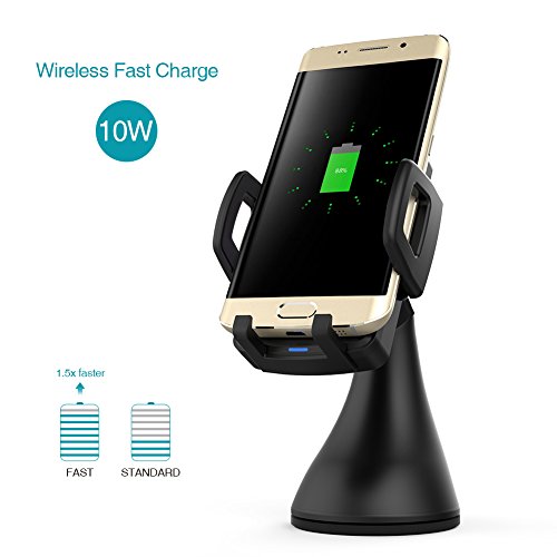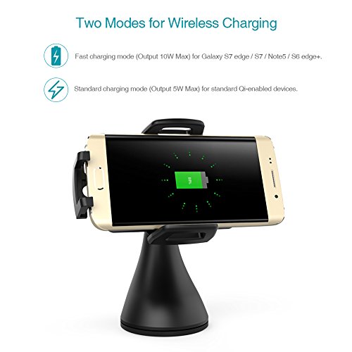 -. Feature : [Wireless Fast Charger] Charge wireless fast charge compatible devices up to 1.5 times faster than standard wireless charging pads, reducing total charging time by up to 50 minutes! Capable of fully charging your Galaxy S7 edge / S7 / Note5 / S6 edge+ in about 2.5 hours. / [Two Wireless Charging Modes] (1) Fast wireless charging (Output 10W Max) for Samsung Galaxy S7 edge / S7 / Note5 / S6 edge+, (2) Standard wireless charging (Output 5W Max) for standard Qi-enabled devices, such as Galaxy S6 edge / S6. / [Two Installation Options] Come with an air vent mount and a suction mount.The 360° rotating ball joint on both mounts enables flexible viewing angles while driving. Make for better viewing of your phone. / [Easy to Use] Simply connect the wireless charger to the car charger, place your phone properly on the wireless charger and the phone begins to charge automatically. No need any cable. / [ LED indicator light] Smartly designed LED indicator light on the car charger clearly indicates the standby status (green) and charging status (blue).