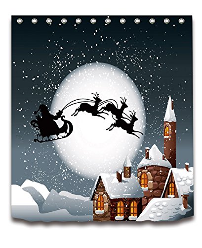 Merry Christmas Season Eve New Year Decorative Decor Gift Shower Curtain Polyester Fabric 3D Digital Printing 72x72" Mildew Resistant Night Santa Claus Sleigh Chimney Silver Bathroom Bath Liner Set