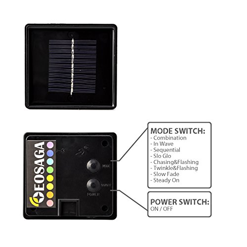 - 2 Switches & 8 Different Lighting Modes: The solar string lights has two switches, one is power ON/OFF and the other is mode control, by press mode button solar fairy string lights will change to Combination, In Wave, Sequential, Slow Glow, Chasing/Flashing, Twinkle/Flashing, Slow fade, Steady on.