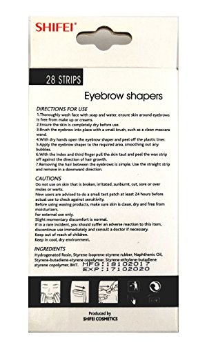 Studio : Haiteng group corp Publisher : Haiteng group corp Binding : Misc. Product Description Removes hair instantly and easily Pre-cut for flawless eyebrowRegrowth appears slower and less noticeable Discover beautiful eyebrows without the pain and guesswork of tweezing. Hair Off instant Eyebrow Shapers are fast, easy and mistake-proof.The shapers are pre-cut and pre-shaped so that when placed under and/or over the eyebrow, they remove the hair to the precise contour of a perfectly shaped eye brow. Each package contains 28 sets of Shapers . Simply place the strip in position, press on, then peel off. Shapers remove not only the longer, thicker hair, but also the fine, tiny hairs so difficult to see and even more difficult to grip with tweezers. The results will be flawless! 0