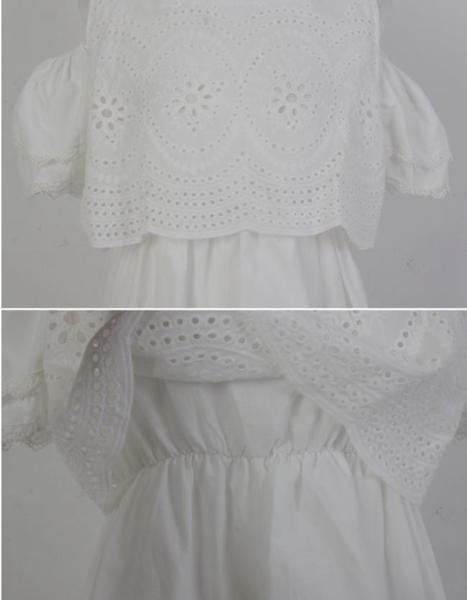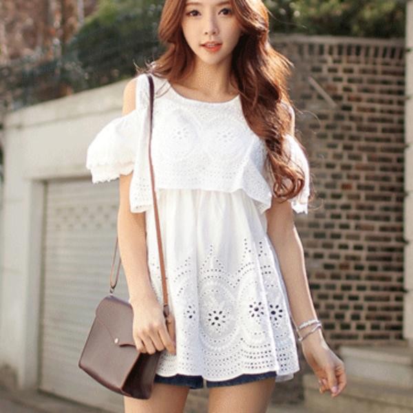 ボヘミアン シフォン 花柄レース オフショル風 切替フリル コットンシャツ チュニック 白