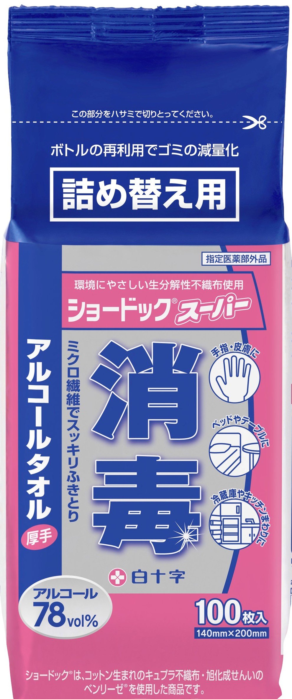 ● Standard: Bottle refilling ● Quantity: 100 pieces ● Ingredients: 76.9 to 81.4 vol% ethanol impregnated ● Sheet size: 140 x 200 mm ● Cotton cellulose nonwoven fabric impregnated with ethanol alcohol towel.