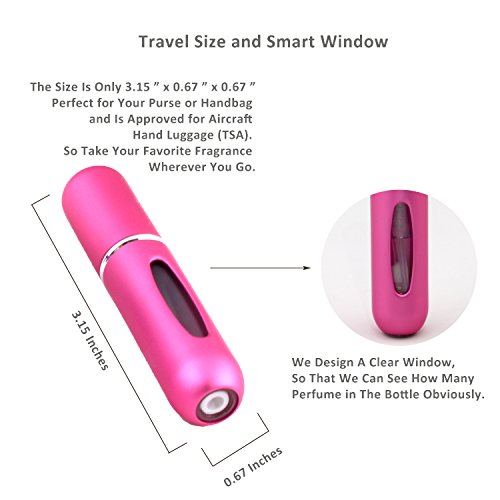 - ♥♥♥ TRAVEL SIZE: The size is only 3.15 x 0.67 x 0.67 inches, the volume is 5ml, there are more than 70 sprays. This travel size atomizer is ideal for your purse or handbag and is approved for aircraft hand luggage (TSA). They're small and can easily fit in a clutch purse or pocket. Match the color with your perfume or cologne bottle, too, so you can easily identify which fragrance you want to take with you. Putting them in your purse, car and at work. Take your favorite fragrance wherever you go