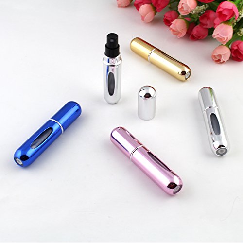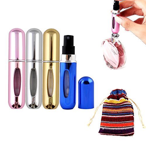 - ♥♥♥ 4 DIFFERENT COLORS PACK: Cute colorful cool refillable atomizers, each pack with 4 different colors (Metallic Light Pink/ Metallic Silver/ Metallic Gold/ Metallic Dark Blue), you can refill them with different perfume without mix, no more dragging around big perfume bottles in your pocketbook during travel. Also great for friends and family who you want to share fragrance with and who want to try out a scent without buying a full size bottle. Making your living fulfilled with perfume
