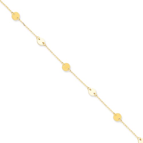 This 9-inch anklet is crafted with 14 karat yellow gold and features high polished and reflective 5mm discs stationed on a delicate cable chain. It is finished with a 1-inch extender and closes with a spring ring clasp.Feature