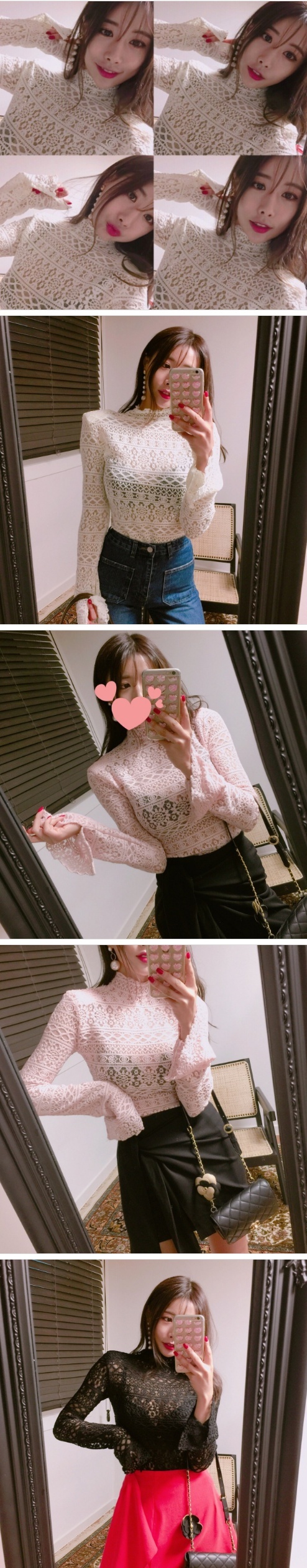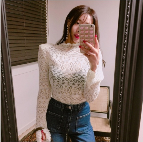 Women`s Lace T-shirts Turtleneck Tee Black Pink Ivory