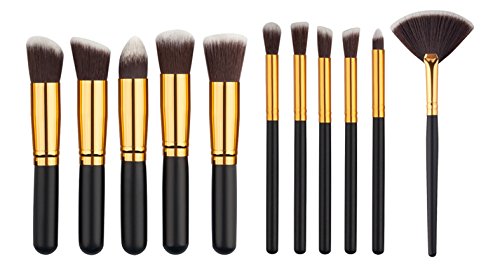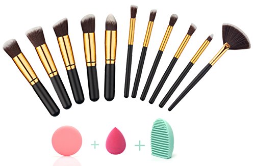 Aeroway 11+3 Pieces Premium Synthetic Professional Makeup Brush Kit With Blender Sponge, Brush Egg and Powder Puff - Black/Gold